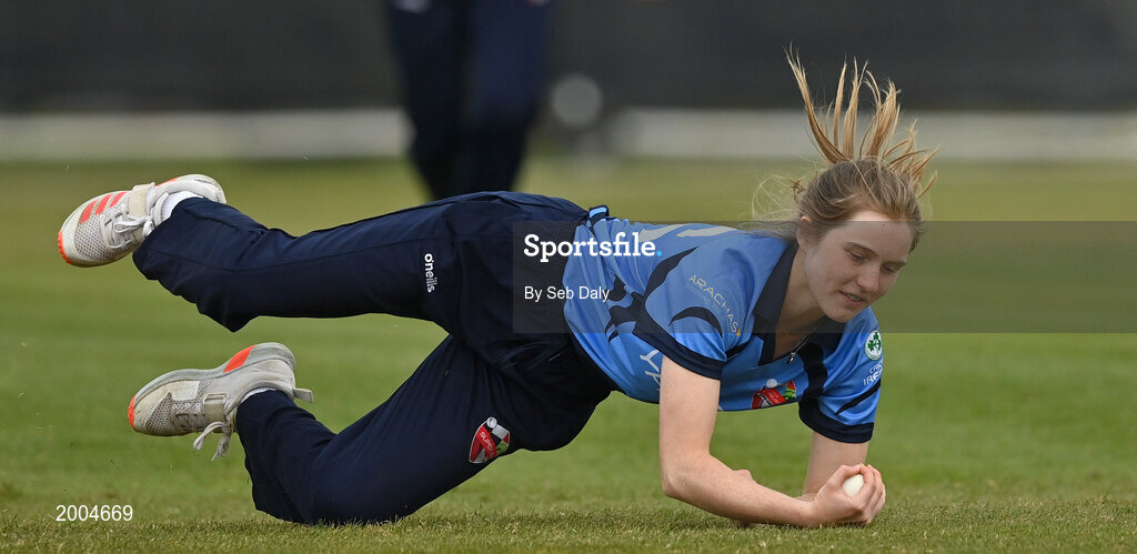 2 May 2021; Georgina Dempsey of Typhoons catches Gaby Lewis of Scorchers during the Arachas Super 50 Cup 2021 match between Typhoons and Scorchers at Pembroke Cricket Club in Dublin. Photo by Seb Daly/Sportsfile