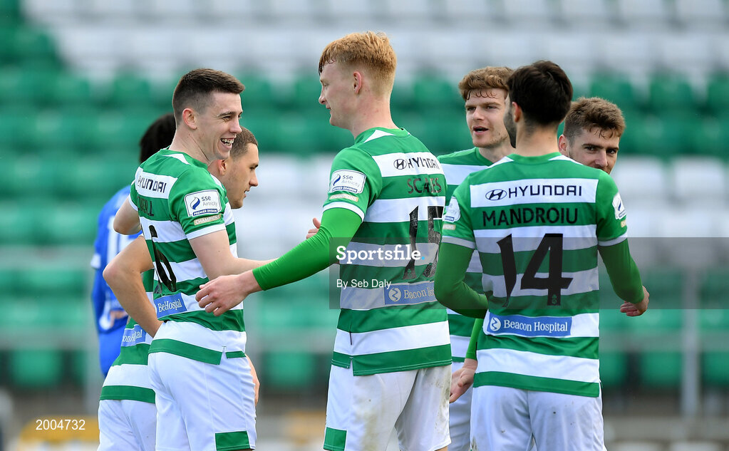 3 May 2021; Gary O'Neill of Shamrock Rovers, left, is congratulated by team-mates after scoring their side's second goal during the SSE Airtricity League Premier Division match between Shamrock Rovers and Waterford at Tallaght Stadium in Dublin. Photo by Seb Daly/Sportsfile