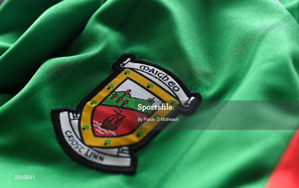 3 May 2021; A general view of the county crest on a jersey during a Mayo football squad portrait session at Elverys MacHale Park in Mayo. Photo by Piaras Ó Mídheach/Sportsfile