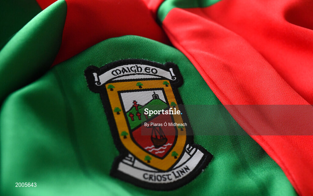 3 May 2021; A general view of the county crest on a jersey during a Mayo football squad portrait session at Elverys MacHale Park in Mayo. Photo by Piaras Ó Mídheach/Sportsfile
