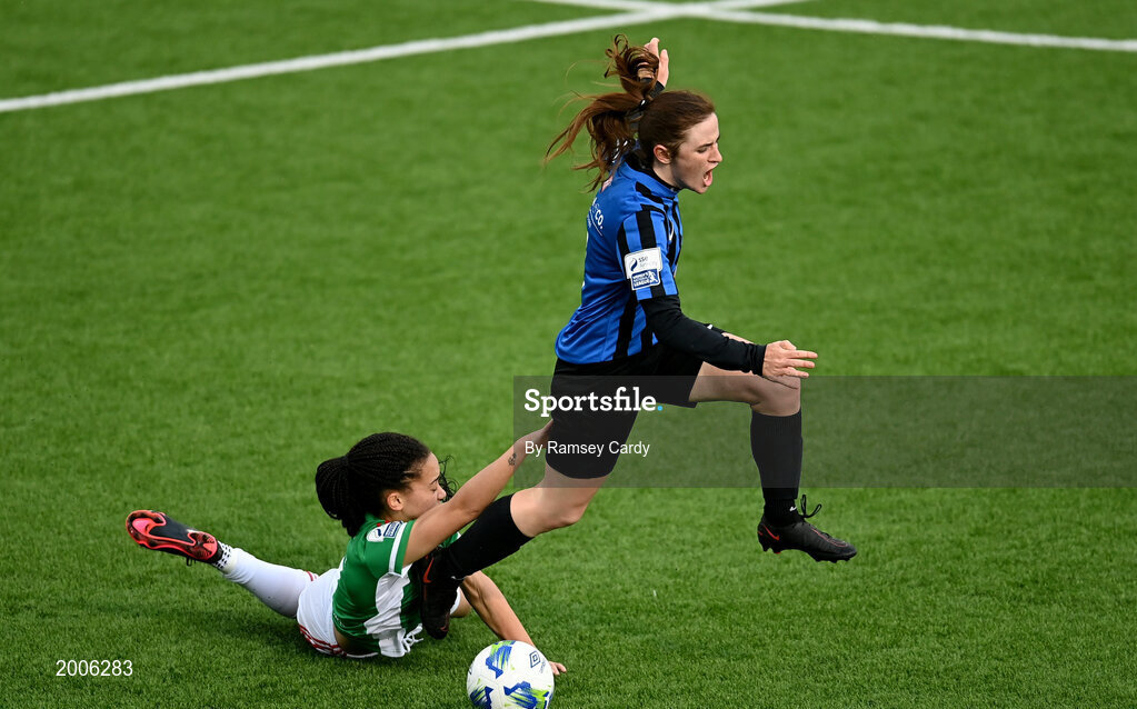 1 May 2021; Emma Donohoe of Athlone Town is tackled by Lauren Egbuloniu of Cork City during the SSE Airtricity Women's National League match between Athlone Town and Cork City at Athlone Town Stadium in Athlone, Westmeath. Photo by Ramsey Cardy/Sportsfile