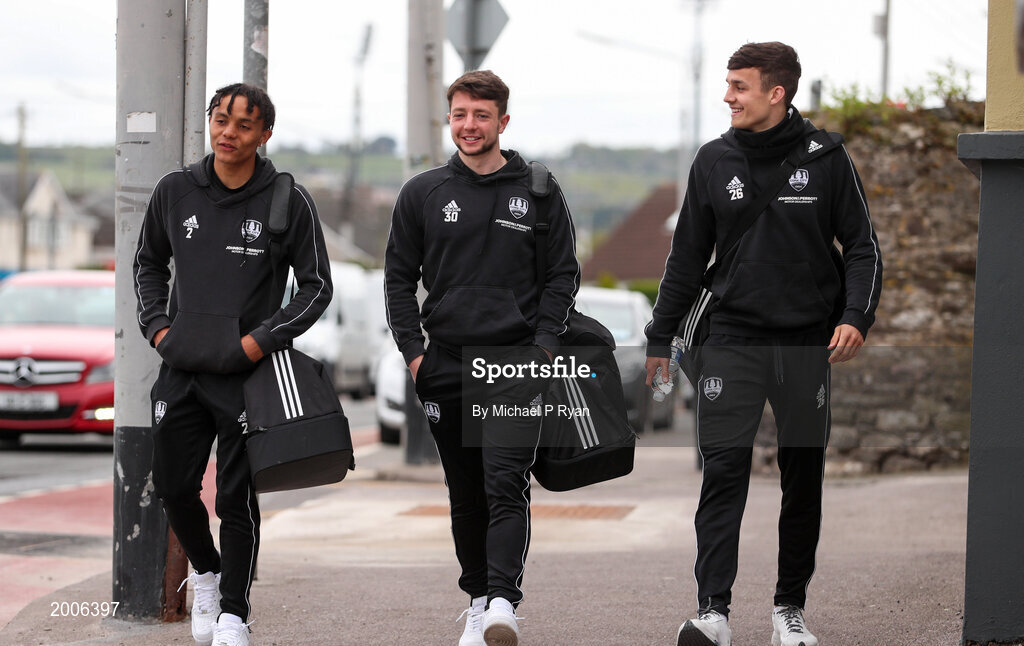 7 May 2021; Cork City players from left, Uniss Kargbo, Jack Baxter and Jamie Wynne arrive ahead of the SSE Airtricity League First Division match between Cork City and Wexford at Turners Cross in Cork. Photo by Michael P Ryan/Sportsfile
