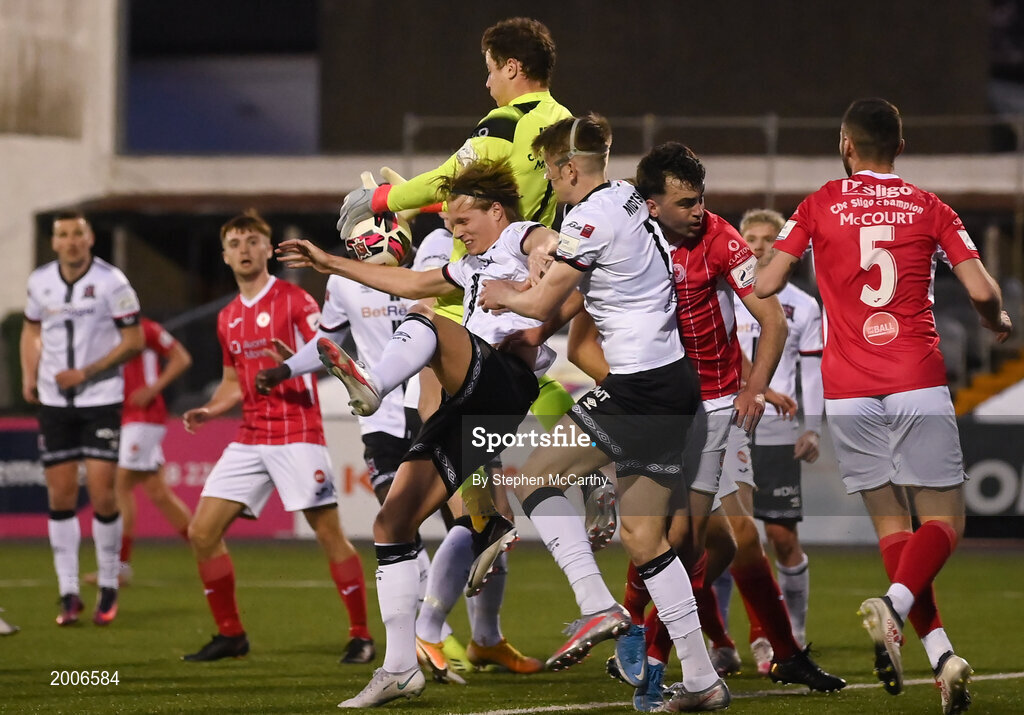 7 May 2021; Sligo Rovers goalkeeper Ed McGinty collects the ball while under pressure during the SSE Airtricity League Premier Division match between Dundalk and Sligo Rovers at Oriel Park in Dundalk, Louth. Photo by Stephen McCarthy/Sportsfile
