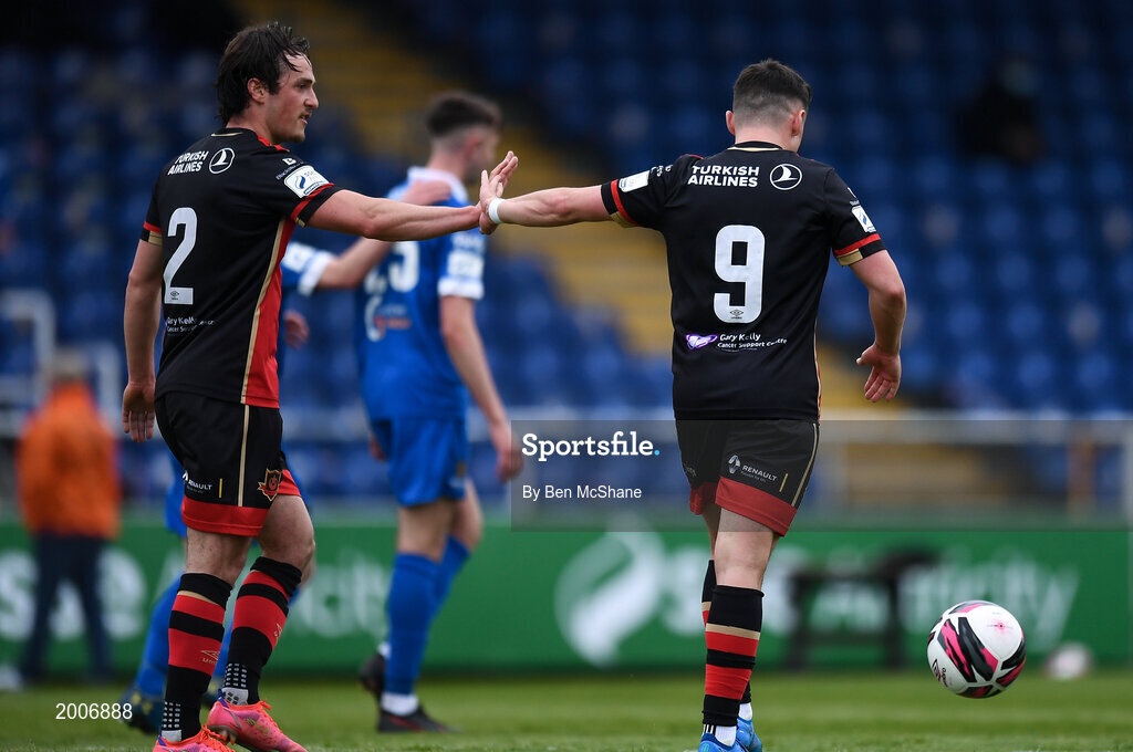 8 May 2021; Chris Lyons of Drogheda United after scoring his side's fifth goal from a penalty, with team-mate James Brown, 2, during the SSE Airtricity League Premier Division match between Waterford and Drogheda United at RSC in Waterford. Photo by Ben McShane/Sportsfile