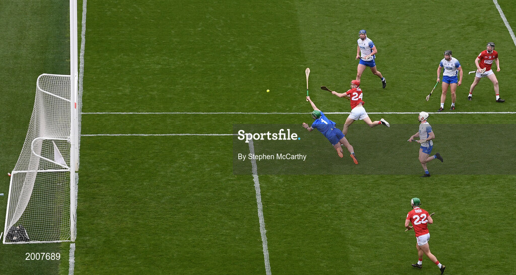 9 May 2021; Alan Connolly of Cork shoots to score his side's fifth goal past Waterford goalkeeper Billy Nolan during the Allianz Hurling League Division 1 Group A Round 1 match between Cork and Waterford at Páirc Ui Chaoimh in Cork. Photo by Stephen McCarthy/Sportsfile