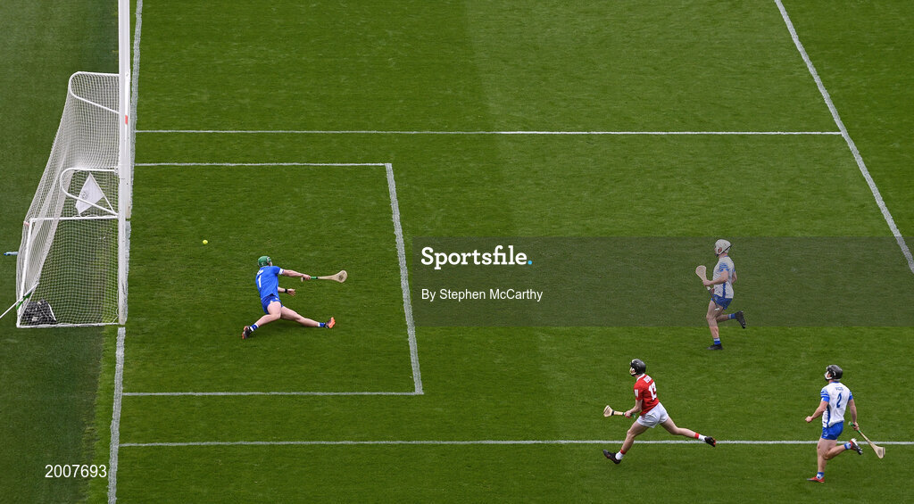 9 May 2021; Jack O'Connor of Cork shoots to score his side's second goal past Waterford goalkeeper Billy Nolan during the Allianz Hurling League Division 1 Group A Round 1 match between Cork and Waterford at Páirc Ui Chaoimh in Cork. Photo by Stephen McCarthy/Sportsfile