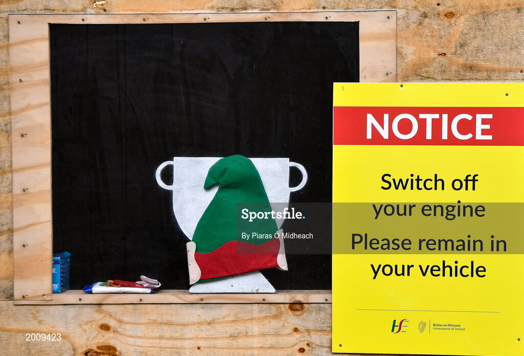 15 May 2021; A cardboard cut-out of the Sam Maguire cup in the window of a Covid-19 testing centre in the ground, not in operation today, before the Allianz Football League Division 2 North Round 1 match between Mayo and Down at Elverys MacHale Park in Castlebar, Mayo. Photo by Piaras Ó Mídheach/Sportsfile