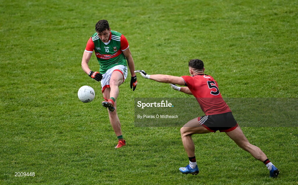 15 May 2021; Fionn McDonagh of Mayo scores a point under pressure from Patrick Murdock of Down during the Allianz Football League Division 2 North Round 1 match between Mayo and Down at Elverys MacHale Park in Castlebar, Mayo. Photo by Piaras Ó Mídheach/Sportsfile