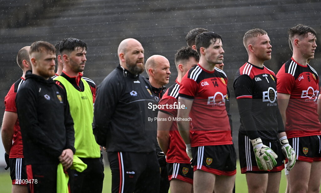 15 May 2021; Down manager Paddy Tally stands with his players for the playing of Amhrán na bhFiann before the Allianz Football League Division 2 North Round 1 match between Mayo and Down at Elverys MacHale Park in Castlebar, Mayo. Photo by Piaras Ó Mídheach/Sportsfile