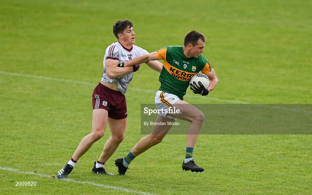 15 May 2021; Jack Barry of Kerry in action against Shane Walsh of Galway during the Allianz Football League Division 1 South Round 1 match between Kerry and Galway at Austin Stack Park in Tralee, Kerry. Photo by Brendan Moran/Sportsfile