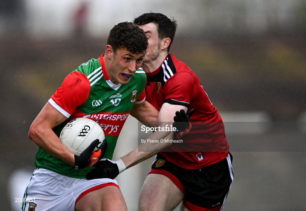 15 May 2021; Fionn McDonagh of Mayo in action against James Guinness of Down during the Allianz Football League Division 2 North Round 1 match between Mayo and Down at Elverys MacHale Park in Castlebar, Mayo. Photo by Piaras Ó Mídheach/Sportsfile