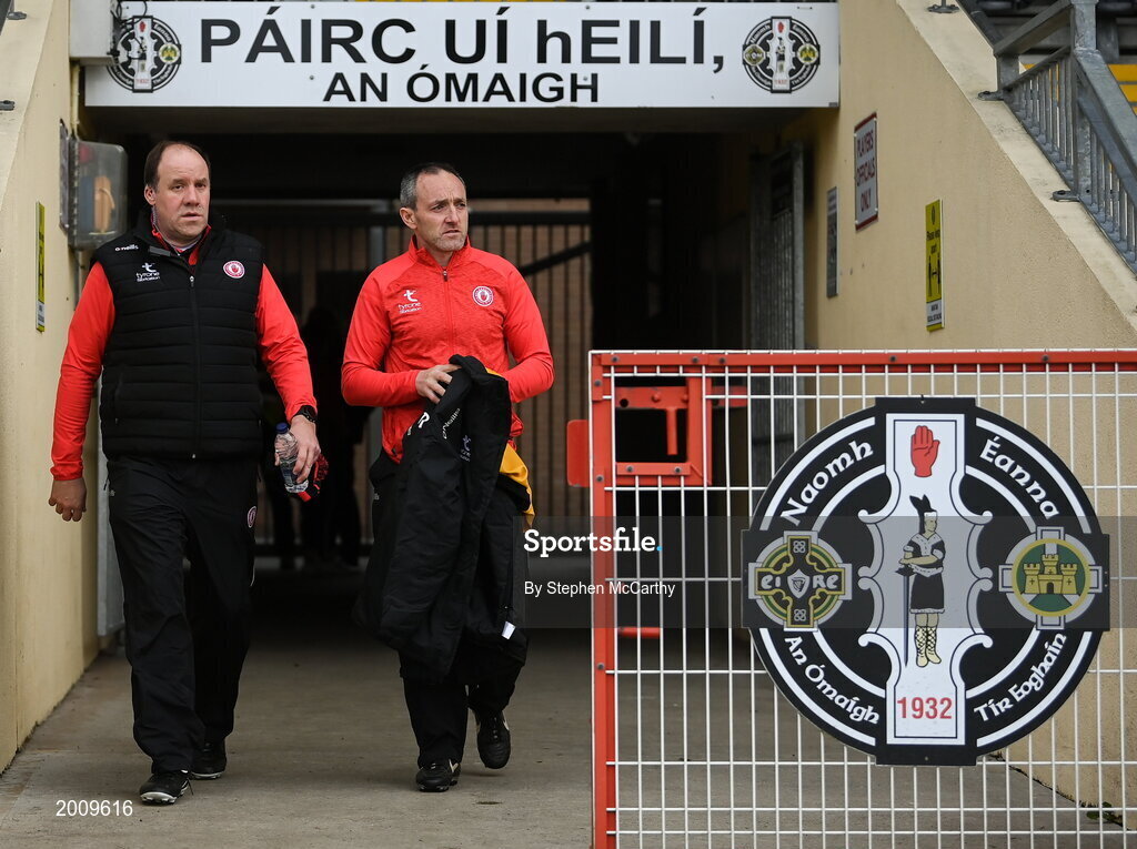 15 May 2021; Tyrone joint-managers Feargal Logan, left, and Brian Dooher before the Allianz Football League Division 1 North Round 1 match between Tyrone and Donegal at Healy Park in Omagh, Tyrone. Photo by Stephen McCarthy/Sportsfile