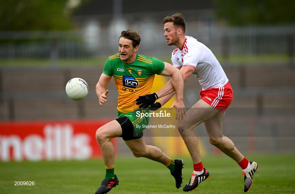 15 May 2021; Hugh McFadden of Donegal in action against Brian Kennedy of Tyrone during the Allianz Football League Division 1 North Round 1 match between Tyrone and Donegal at Healy Park in Omagh, Tyrone. Photo by Stephen McCarthy/Sportsfile