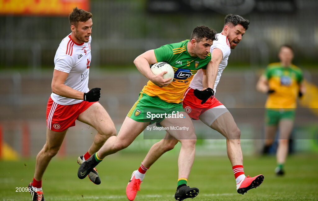 15 May 2021; Patrick McBrearty of Donegal in action against Matthew Donnelly of Tyrone during the Allianz Football League Division 1 North Round 1 match between Tyrone and Donegal at Healy Park in Omagh, Tyrone. Photo by Stephen McCarthy/Sportsfile
