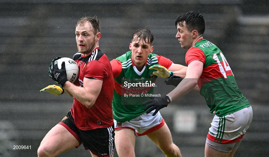 15 May 2021; Gerard McGovern of Down in action against Eoghan McLaughlin, 21, and Cillian O'Connor of Mayo during the Allianz Football League Division 2 North Round 1 match between Mayo and Down at Elverys MacHale Park in Castlebar, Mayo. Photo by Piaras Ó Mídheach/Sportsfile