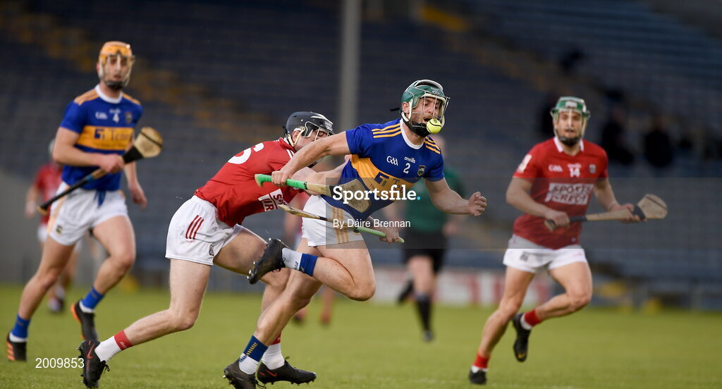 15 May 2021; Cathal Barrett of Tipperary in action against Jack O’Connor of Cork during the Allianz Hurling League Division 1 Group A Round 2 match between Tipperary and Cork at Semple Stadium in Thurles, Tipperary. Photo by Daire Brennan/Sportsfile
