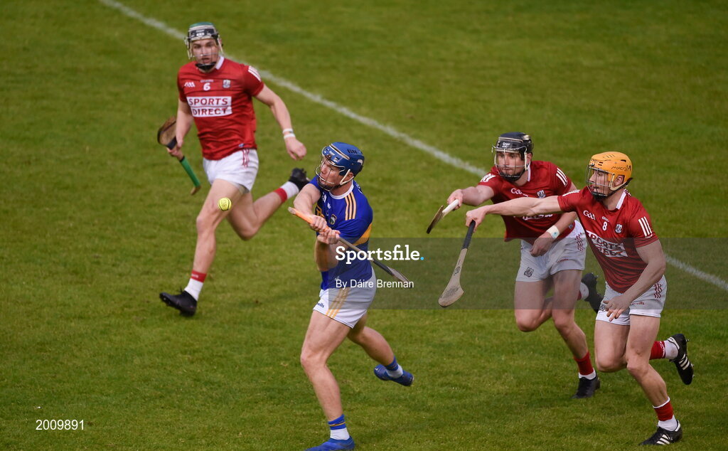 15 May 2021; Jason Forde of Tipperary in action against Niall Cashman, left, and Billy Hennessy of Cork during the Allianz Hurling League Division 1 Group A Round 2 match between Tipperary and Cork at Semple Stadium in Thurles, Tipperary. Photo by Daire Brennan/Sportsfile