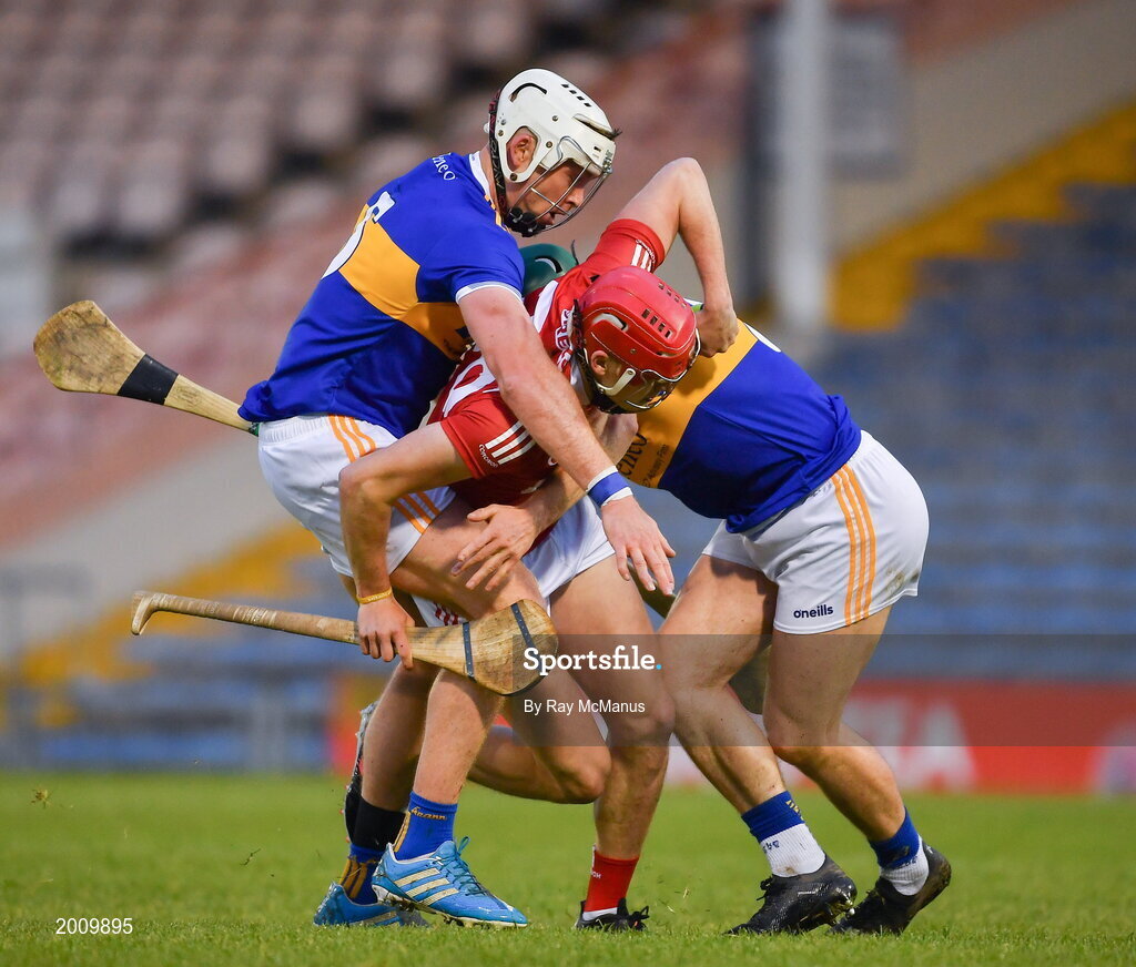 15 May 2021; Alan Connolly of Cork is tackled by Tipperary players Padraic Maher, left, and Cathal Barrett during the Allianz Hurling League Division 1 Group A Round 2 match between Tipperary and Cork at Semple Stadium in Thurles, Tipperary. Photo by Ray McManus/Sportsfile