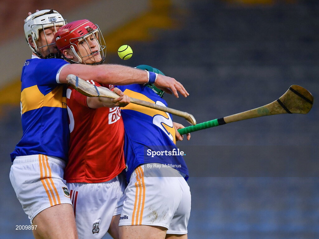 15 May 2021; Alan Connolly of Cork is tackled by Tipperary players Padraic Maher, left, and Cathal Barrett during the Allianz Hurling League Division 1 Group A Round 2 match between Tipperary and Cork at Semple Stadium in Thurles, Tipperary. Photo by Ray McManus/Sportsfile