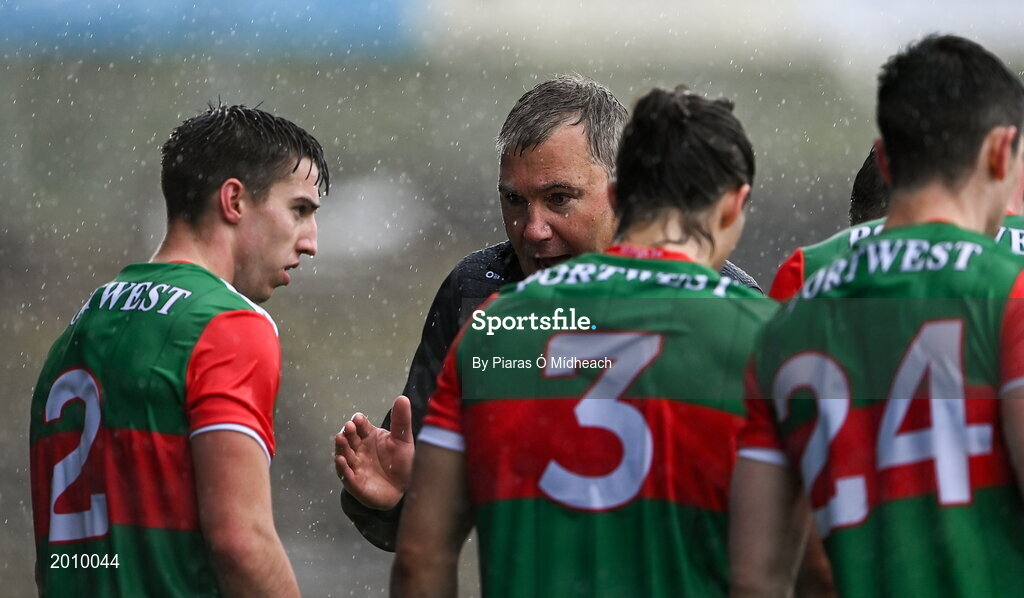 15 May 2021; Mayo manager James Horan talks to his players during a water break during the Allianz Football League Division 2 North Round 1 match between Mayo and Down at Elverys MacHale Park in Castlebar, Mayo. Photo by Piaras Ó Mídheach/Sportsfile