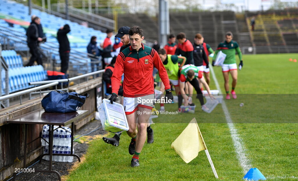 15 May 2021; Diarmuid O'Connor of Mayo places his individual gear box on the sideline before the Allianz Football League Division 2 North Round 1 match between Mayo and Down at Elverys MacHale Park in Castlebar, Mayo. Photo by Piaras Ó Mídheach/Sportsfile