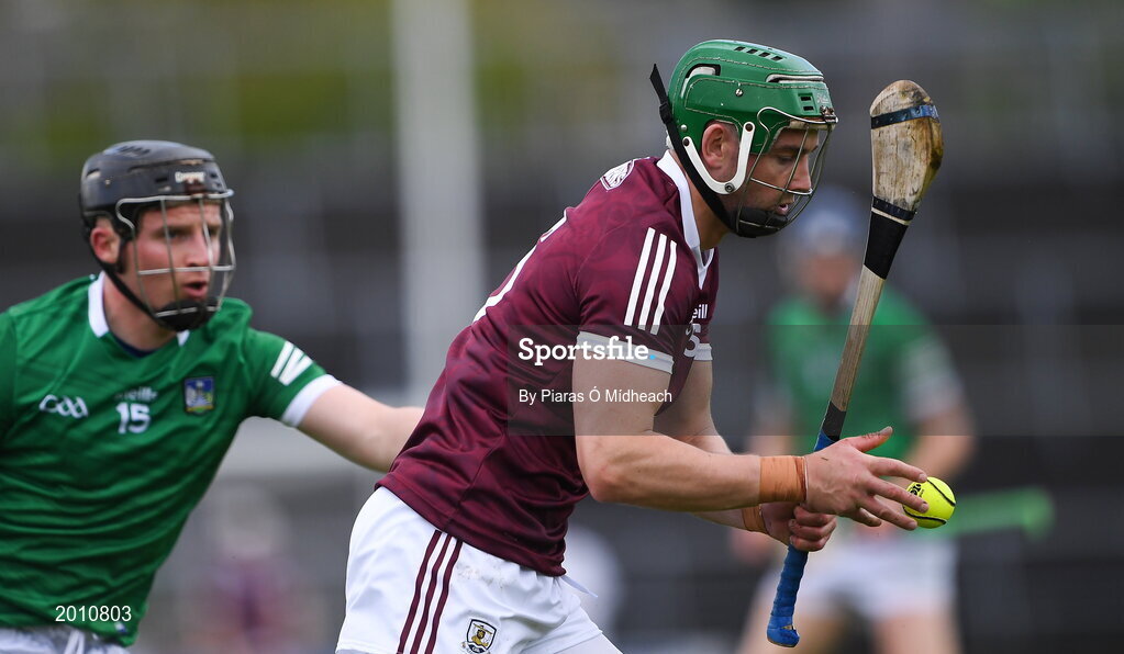 16 May 2021; Adrian Tuohey of Galway in action against Peter Casey of Limerick during the Allianz Hurling League Division 1 Group A Round 2 match between Galway and Limerick at Pearse Stadium in Galway. Photo by Piaras Ó Mídheach/Sportsfile