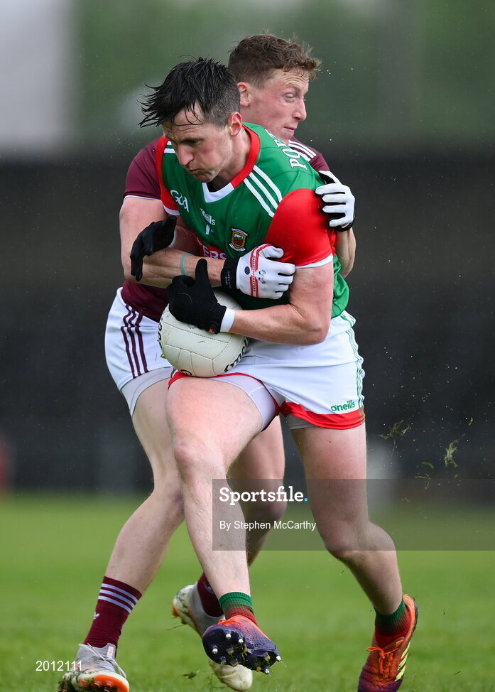 22 May 2021; Cillian O'Connor of Mayo is tackled by Ray Connellan of Westmeath during the Allianz Football League Division 2 North Round 2 match between Westmeath and Mayo at TEG Cusack Park in Mullingar, Westmeath. Photo by Stephen McCarthy/Sportsfile