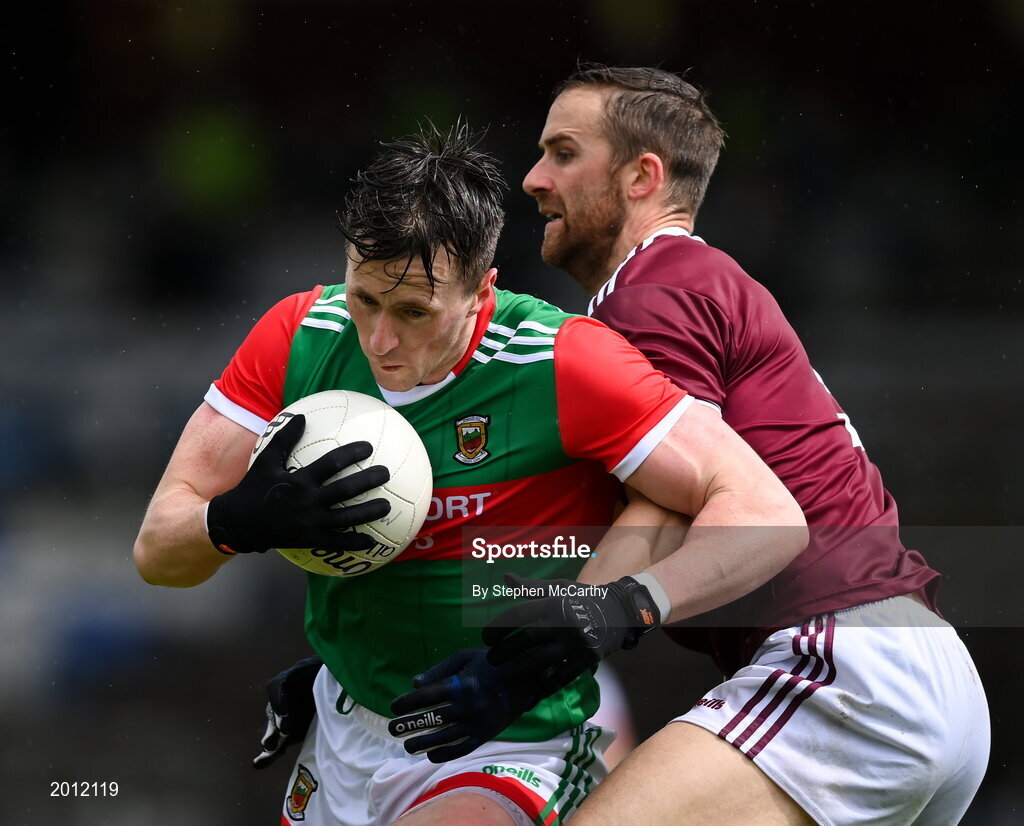 22 May 2021; Cillian O'Connor of Mayo is tackled by Kevin Maguire of Westmeath during the Allianz Football League Division 2 North Round 2 match between Westmeath and Mayo at TEG Cusack Park in Mullingar, Westmeath. Photo by Stephen McCarthy/Sportsfile