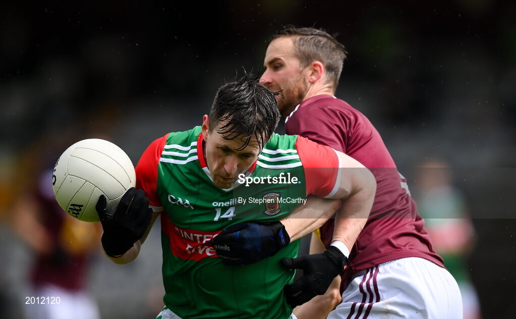 22 May 2021; Cillian O'Connor of Mayo is tackled by Kevin Maguire of Westmeath during the Allianz Football League Division 2 North Round 2 match between Westmeath and Mayo at TEG Cusack Park in Mullingar, Westmeath. Photo by Stephen McCarthy/Sportsfile