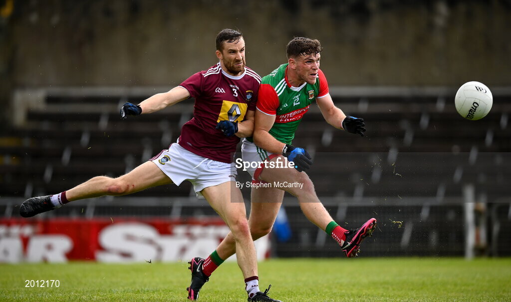 22 May 2021; Jordan Flynn of Mayo in action against Kevin Maguire of Westmeath during the Allianz Football League Division 2 North Round 2 match between Westmeath and Mayo at TEG Cusack Park in Mullingar, Westmeath. Photo by Stephen McCarthy/Sportsfile