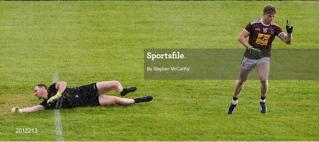 22 May 2021; Luke Loughlin of Westmeath celebrates after scoring his side's first goal past Mayo goalkeeper Rob Hennelly during the Allianz Football League Division 2 North Round 2 match between Westmeath and Mayo at TEG Cusack Park in Mullingar, Westmeath. Photo by Stephen McCarthy/Sportsfile