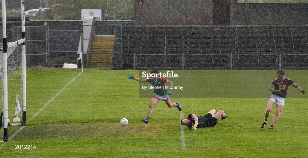 22 May 2021; Luke Loughlin of Westmeath scores his side's first goal past Mayo goalkeeper Rob Hennelly and defender Oisin Mullin during the Allianz Football League Division 2 North Round 2 match between Westmeath and Mayo at TEG Cusack Park in Mullingar, Westmeath. Photo by Stephen McCarthy/Sportsfile