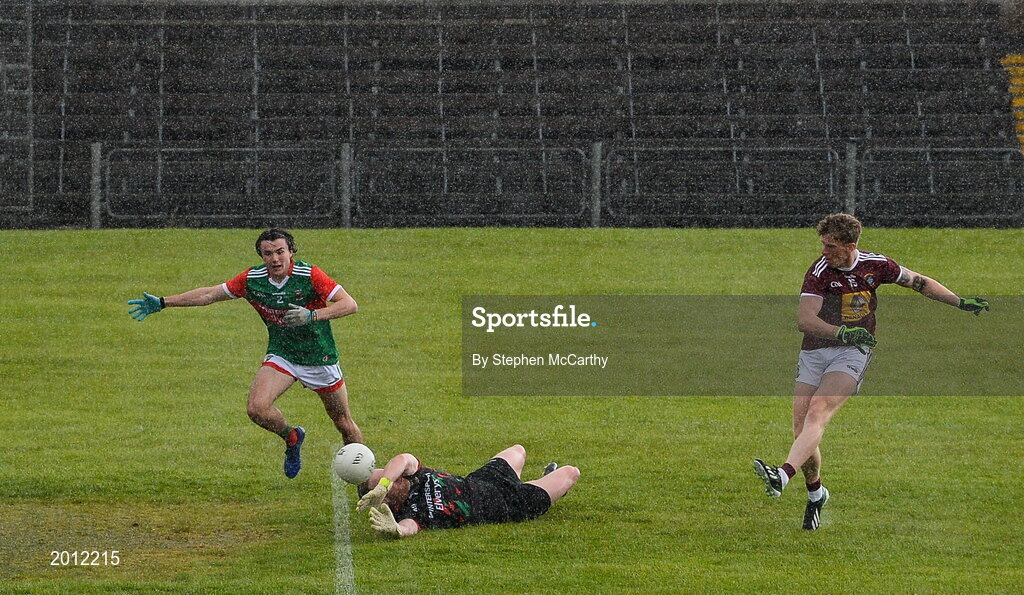 22 May 2021; Luke Loughlin of Westmeath scores his side's first goal past Mayo goalkeeper Rob Hennelly and defender Oisin Mullin during the Allianz Football League Division 2 North Round 2 match between Westmeath and Mayo at TEG Cusack Park in Mullingar, Westmeath. Photo by Stephen McCarthy/Sportsfile