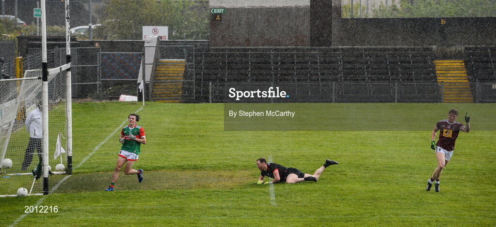 22 May 2021; Luke Loughlin of Westmeath celebrates after scoring his side's first goal past Mayo goalkeeper Rob Hennelly and defender Oisin Mullin during the Allianz Football League Division 2 North Round 2 match between Westmeath and Mayo at TEG Cusack Park in Mullingar, Westmeath. Photo by Stephen McCarthy/Sportsfile
