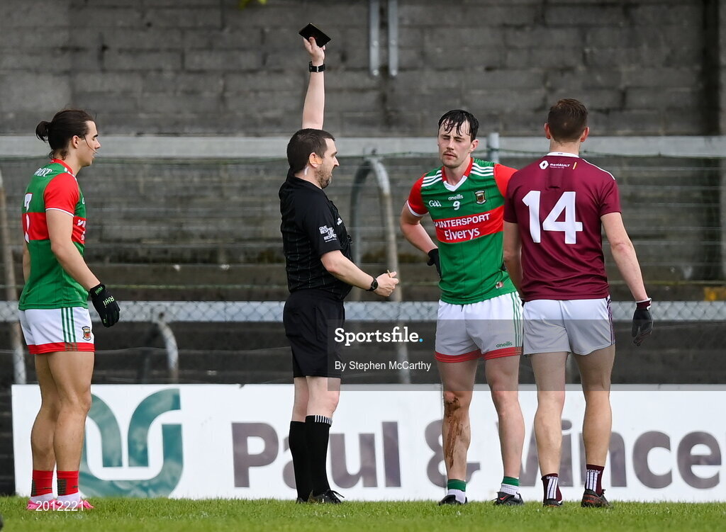 22 May 2021; Referee Noel Mooney issues Diarmuid O'Connor of Mayo with a black card during the Allianz Football League Division 2 North Round 2 match between Westmeath and Mayo at TEG Cusack Park in Mullingar, Westmeath. Photo by Stephen McCarthy/Sportsfile