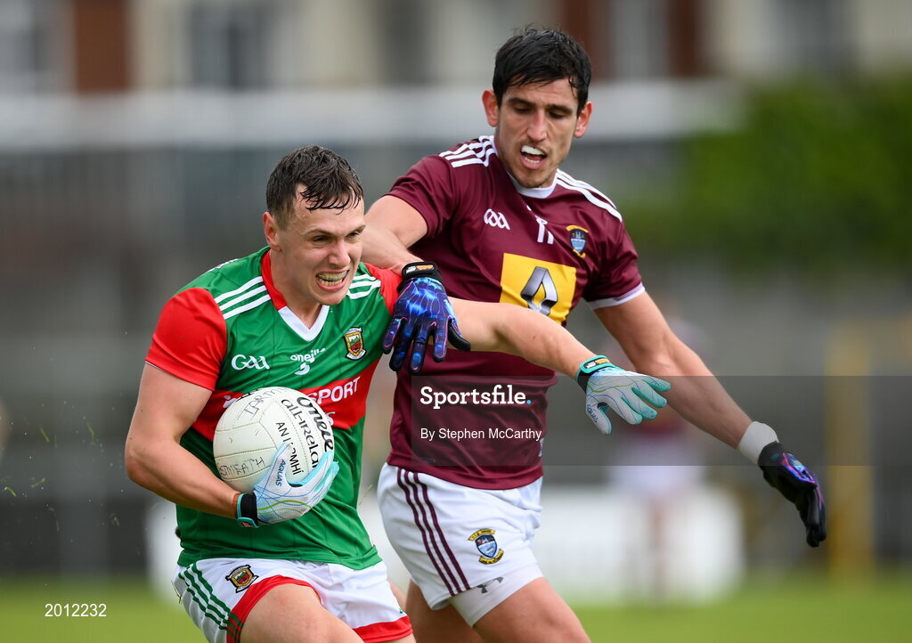 22 May 2021; Michael Plunkett of Mayo in action against Denis Corroon of Westmeath during the Allianz Football League Division 2 North Round 2 match between Westmeath and Mayo at TEG Cusack Park in Mullingar, Westmeath. Photo by Stephen McCarthy/Sportsfile