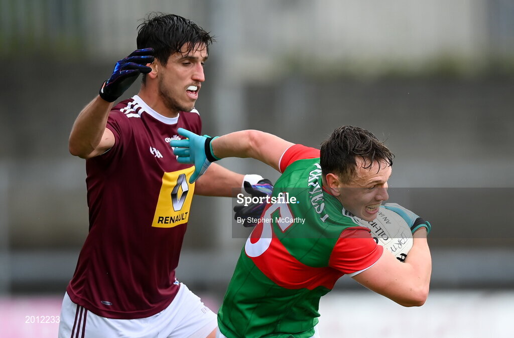 22 May 2021; Michael Plunkett of Mayo in action against Denis Corroon of Westmeath during the Allianz Football League Division 2 North Round 2 match between Westmeath and Mayo at TEG Cusack Park in Mullingar, Westmeath. Photo by Stephen McCarthy/Sportsfile