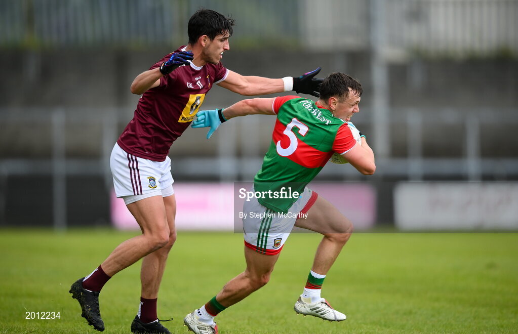 22 May 2021; Michael Plunkett of Mayo in action against Denis Corroon of Westmeath during the Allianz Football League Division 2 North Round 2 match between Westmeath and Mayo at TEG Cusack Park in Mullingar, Westmeath. Photo by Stephen McCarthy/Sportsfile