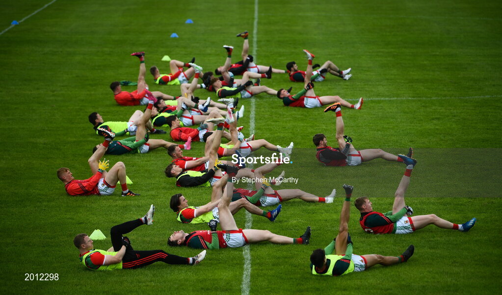 22 May 2021; Mayo players warm up before the Allianz Football League Division 2 North Round 2 match between Westmeath and Mayo at TEG Cusack Park in Mullingar, Westmeath. Photo by Stephen McCarthy/Sportsfile