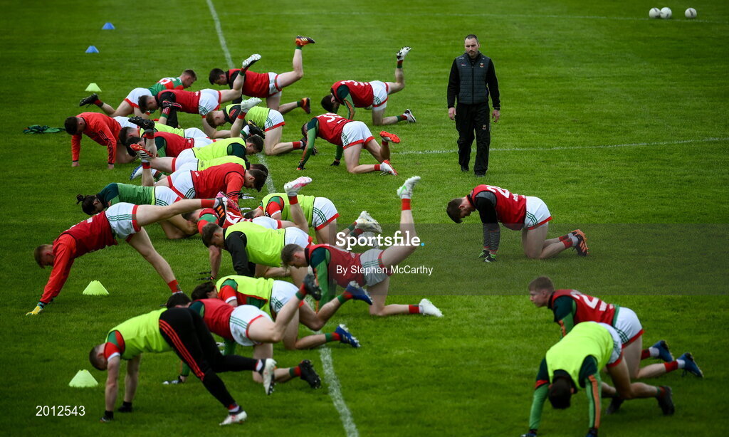 22 May 2021; Mayo head of strength & conditioning Conor Finn conducts pre-match stretching with Mayo players before the Allianz Football League Division 2 North Round 2 match between Westmeath and Mayo at TEG Cusack Park in Mullingar, Westmeath. Photo by Stephen McCarthy/Sportsfile