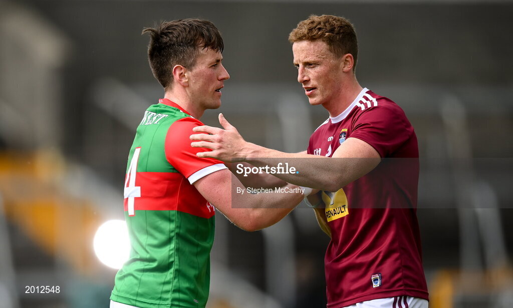 22 May 2021; Cillian O'Connor of Mayo and Ray Connellan of Westmeath following the Allianz Football League Division 2 North Round 2 match between Westmeath and Mayo at TEG Cusack Park in Mullingar, Westmeath. Photo by Stephen McCarthy/Sportsfile