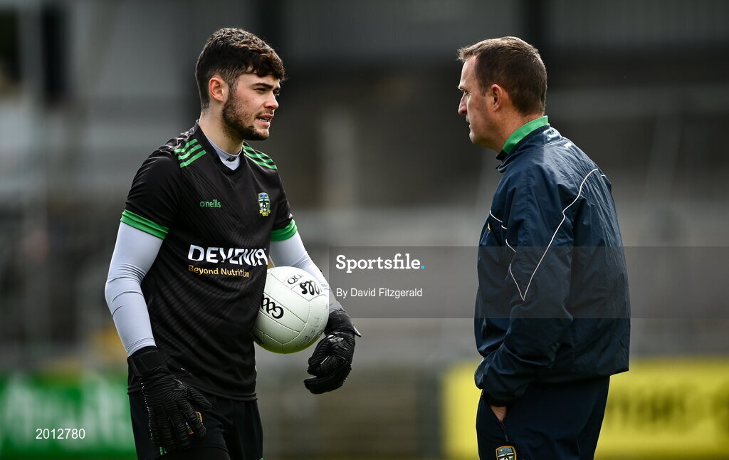 23 May 2021; Meath goalkeeper Harry Hogan speaks with manager Andy McEntee before the Allianz Football League Division 2 North Round 2 match between Down and Meath at Athletic Grounds in Armagh. Photo by David Fitzgerald/Sportsfile