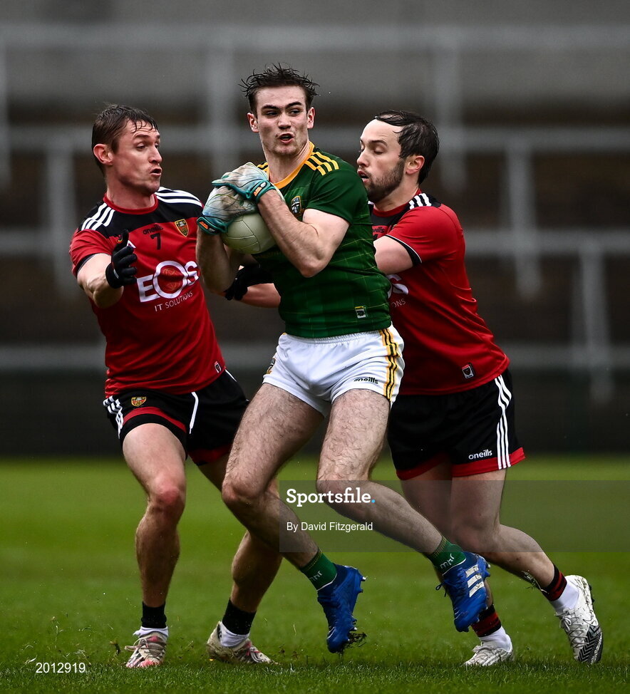 23 May 2021; Fionn Reilly of Meath in action against Caolan Mooney, left, and Corey Quinn of Down during the Allianz Football League Division 2 North Round 2 match between Down and Meath at Athletic Grounds in Armagh. Photo by David Fitzgerald/Sportsfile
