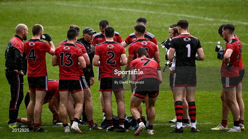23 May 2021; Down manager Paddy Tally talks to his players at the water break during the Allianz Football League Division 2 North Round 2 match between Down and Meath at Athletic Grounds in Armagh. Photo by David Fitzgerald/Sportsfile