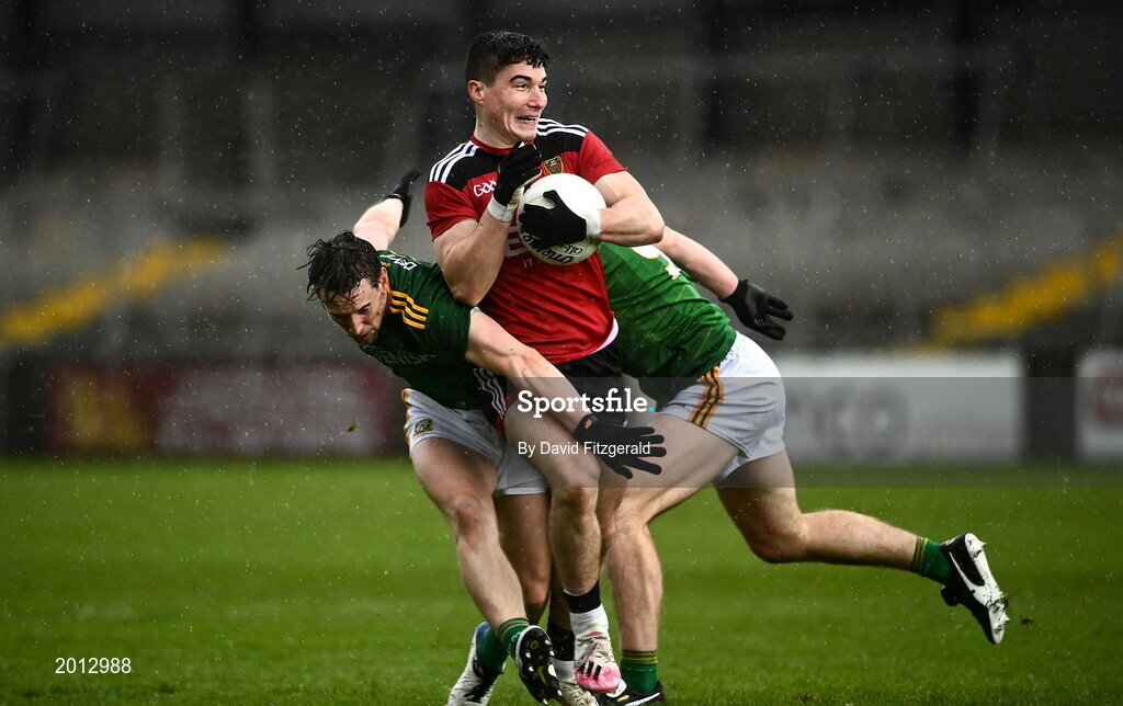 23 May 2021; Daniel Guinness of Down in action against Bryan McMahon, left, and Padraic Harnan of Meath during the Allianz Football League Division 2 North Round 2 match between Down and Meath at Athletic Grounds in Armagh. Photo by David Fitzgerald/Sportsfile