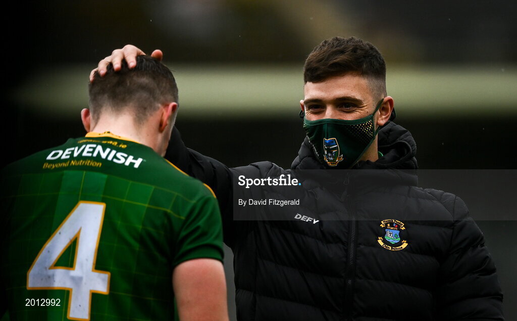 23 May 2021; David McEntee of Meath, right, celebrates with team-mate Ronan Ryan following the Allianz Football League Division 2 North Round 2 match between Down and Meath at Athletic Grounds in Armagh. Photo by David Fitzgerald/Sportsfile