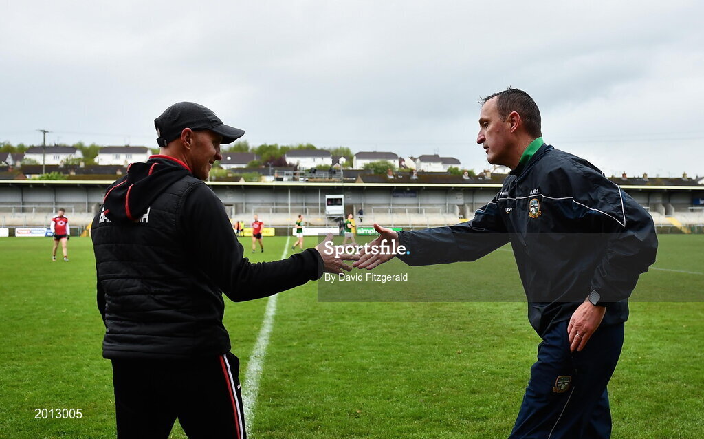 23 May 2021; Down manager Paddy Tally, left, and Meath manager Andy McEntee shake hands following the Allianz Football League Division 2 North Round 2 match between Down and Meath at Athletic Grounds in Armagh. Photo by David Fitzgerald/Sportsfile