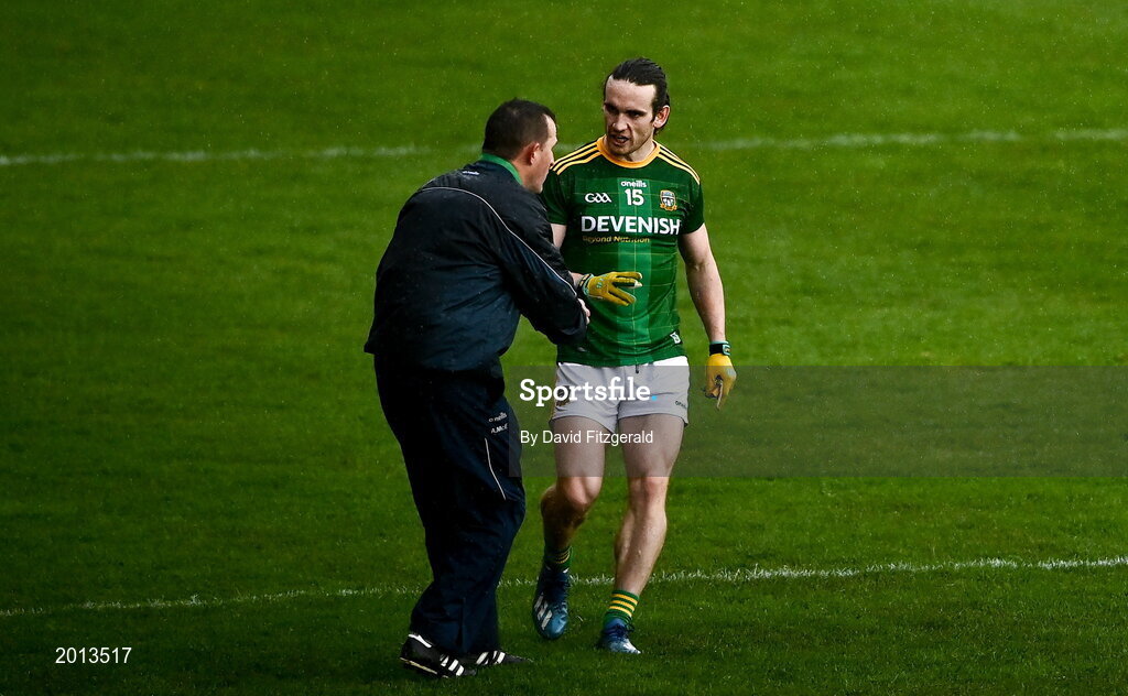 23 May 2021; Cillian O'Sullivan of Meath with manager Andy McEntee during the Allianz Football League Division 2 North Round 2 match between Down and Meath at Athletic Grounds in Armagh. Photo by David Fitzgerald/Sportsfile