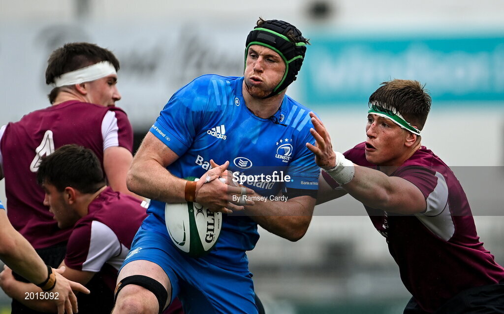 28 May 2021; Ryan Baird of Leinster A is tackled by Joe McCarthy of Ireland U20 during the match between Ireland U20 and Leinster A at Energia Park in Dublin. Photo by Ramsey Cardy/Sportsfile