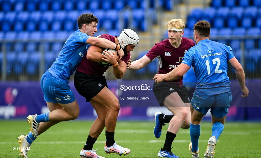 28 May 2021; Ben Carson of Ireland U20 is tackled by Cormac Foley of Leinster A during the match between Ireland U20 and Leinster A at Energia Park in Dublin. Photo by Ramsey Cardy/Sportsfile